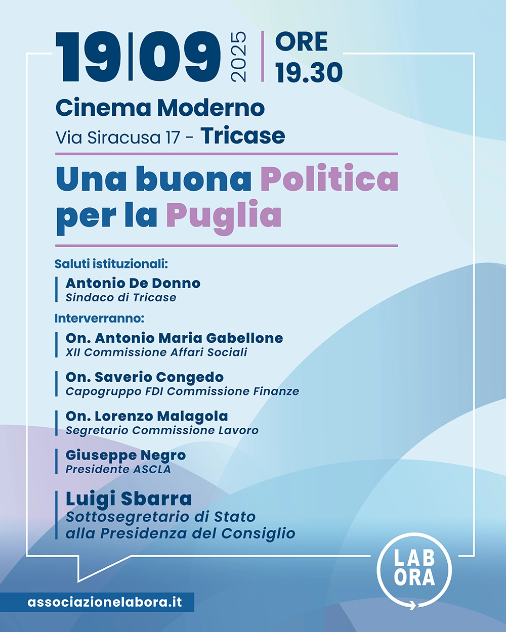 Dopo i saluti istituzionali del sindaco di Tricase Antonio De Donno, interverranno: l’onorevole Antonio Maria Gabellone, membro della XII Commissione Affari Sociali; l’onorevole Saverio Congedo, capogruppo di Fratelli d’Italia in Commissione Finanze; l’onorevole Lorenzo Malagola, segretario della XI Commissione Lavoro.