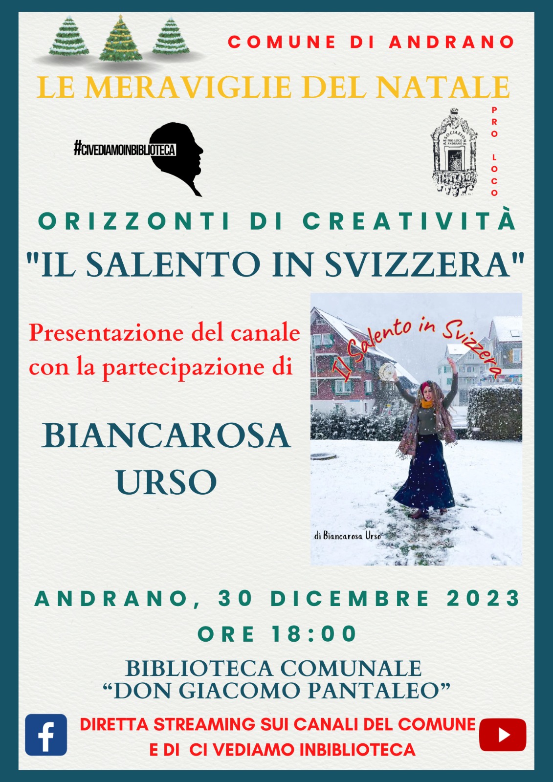 “Amici di ‘Il Salento in Svizzera’”, scrive Biancarosa in una nota, “con immenso piacere sono lieta di annunciarvi e invitarvi a questo imperdibile evento. Spero tanto possa essere il primo (mi auguro di una lunga serie) in cui il protagonista assoluto è e sarà “Il Salento in Svizzera”.