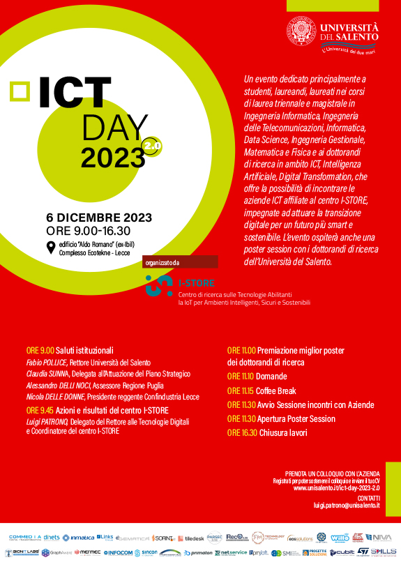 A fine giornata, inoltre, è prevista una poster session dedicata ai dottorandi di ricerca dell’Università del Salento, offrendo loro uno spazio per condividere le loro ricerche e progetti innovativi nell’ambito dell’ICT.