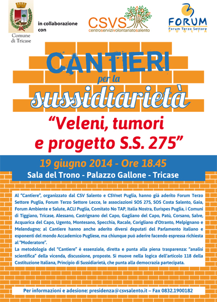 Un Cantiere per la sussidiarietà per tornare a discutere di salute pubblica e di emergenza tumori nel Salento. È quello in programma il prossimo giovedì 19 giugno a Tricase (ore 19, Palazzo Gallone), organizzato dal CSV Salento in collaborazione con il Comune di Tricase e il Forum Terzo Settore.