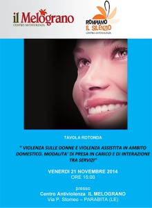 Si terrà venerdi 21 novembre, presso la sede del Centro Antiviolenza “Il Melograno” di Parabita, alle ore 15, la tavola rotonda sul tema “Violenza sulle donne e violenza assistita in ambito domestico. Modalità di presa in carico e di interazione tra servizi”, promossa da SANFRA – Comunità S. Francesco Centro Antiviolenza “Il Melograno” e dal Centro Antiviolenza “Rompiamo il Silenzio” Associazione Sud Est Donne, con il Patrocinio della Regione Puglia e del Garante dei Diritti dell’Infanzia e dell’Adolescenza Regione Puglia.