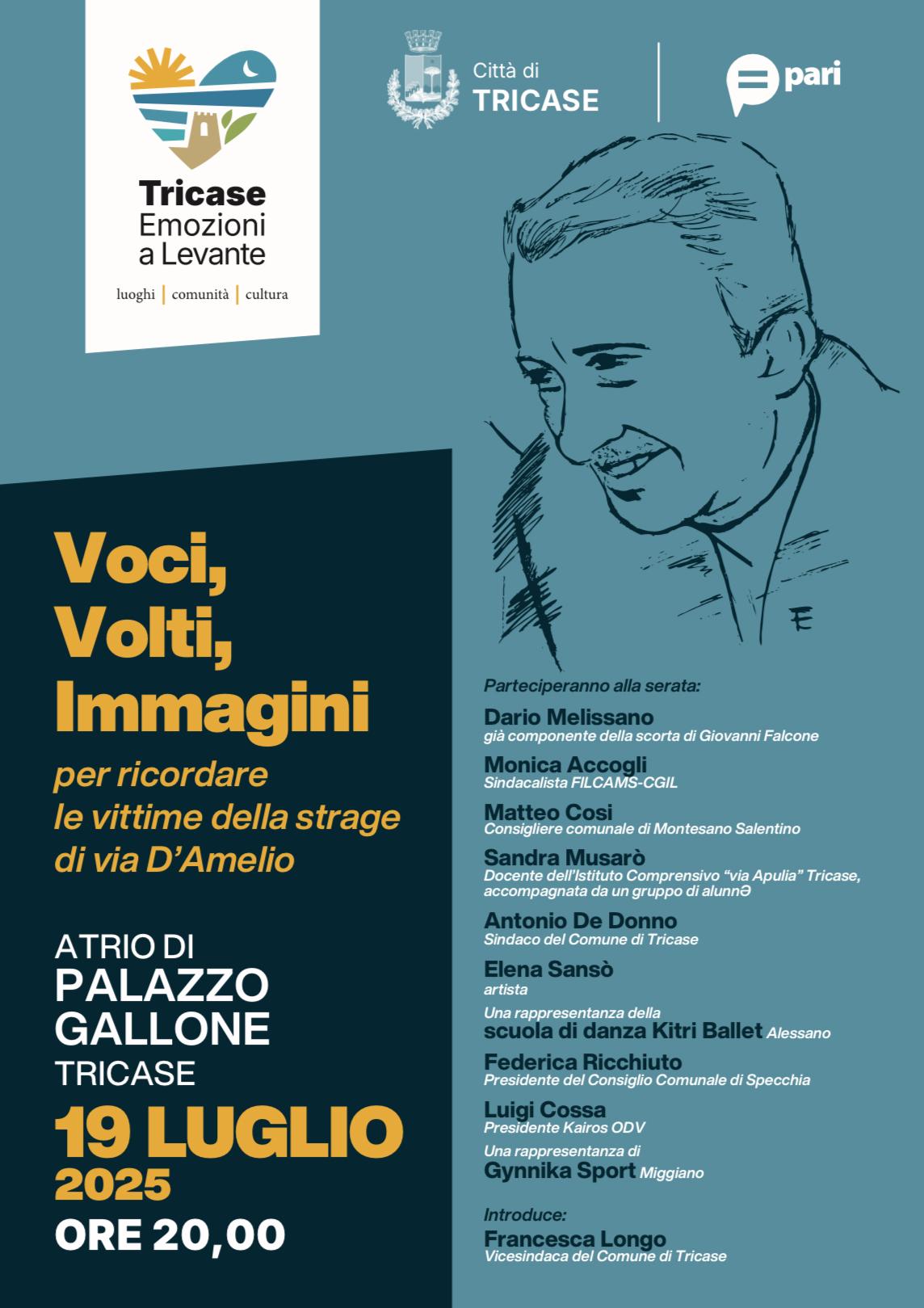 Nasce da qui l’idea di un evento per ricordare quel triste giorno e le sue vittime. Il Comune di Tricase con Pari associazione culturale organizza per sabato 19 luglio un incontro in cui amministratori e amministratrici; operatori e operatrici culturali; artisti e artiste, leggeranno un proprio pensiero originale su via D’Amelio e sull’eredità culturale di Paolo Borsellino, dando luogo a un incontro e a uno scambio di riflessioni che aiuti non solo a tenere viva la memoria, ma anche a pretendere da noi, come singoli e come comunità, uno sforzo quotidiano nel contrastare la violenza criminale.