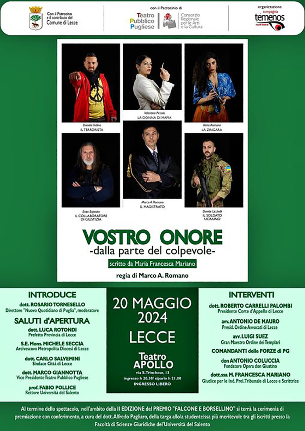 Nel bellissimo Teatro Apollo, col Patrocinio e il contributo del Comune di Lecce e il Patrocinio del Teatro Pubblico Pugliese questa sera porta in scena, con la regia di Marco Antonio Romano, lo spettacolo teatrale Vostro Onore, dalla parte del colpevole, scritto dalla magistrata salentina Francesca Mariano, Gip presso il Tribunale di Lecce e scrittrice.