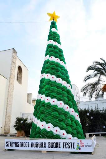 Dieci metri d’altezza, realizzato utilizzando 15mila bicchieri di plastica bianchi, rossi, verdi e gialli, disposti a mo’ di esagono. È nato così l’albero di Natale che campeggia in piazza San Francesco a Melissano, realizzato dal lavoro certosino del gruppo di “Stay’nstreet”, l’associazione che si è occupata di animare e colorare il Natale dei melissanesi, in collaborazione con l’Amministrazione comunale.