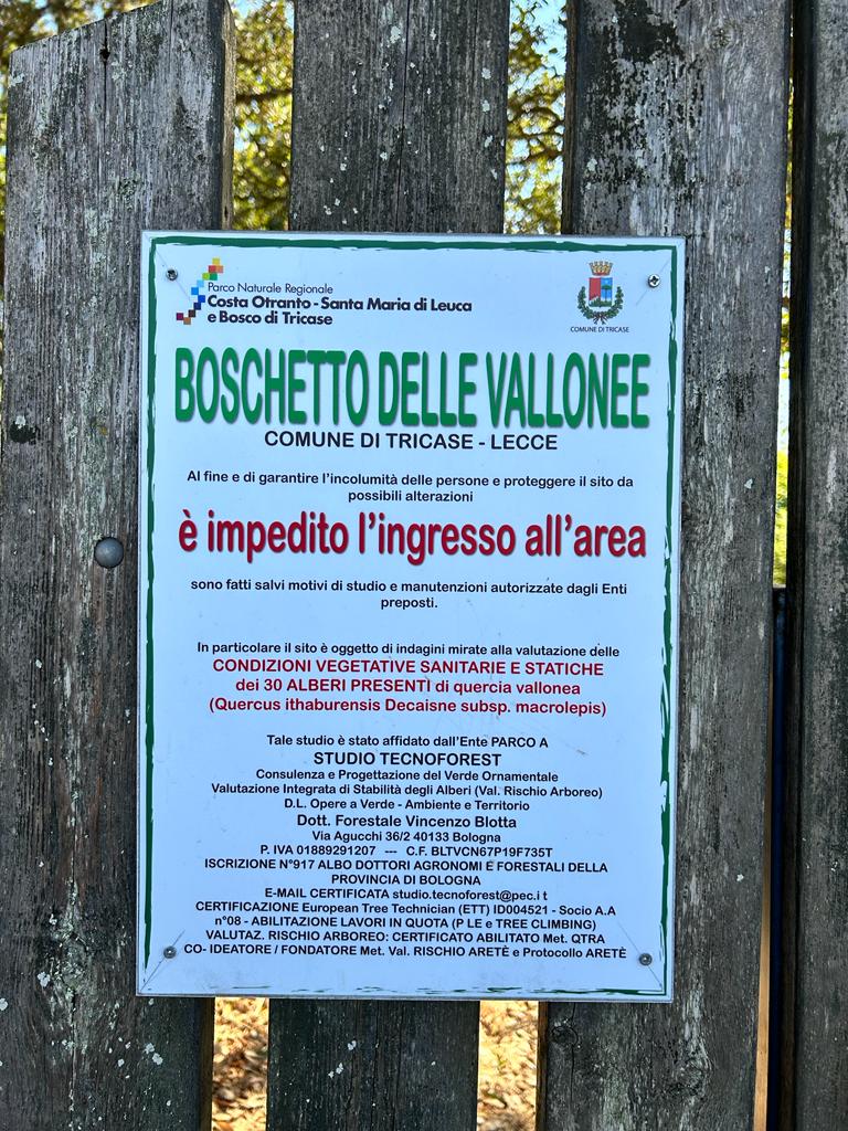 Qualcuno se ne starà occupando? Sul cancelletto all’entrata, oggi sotto lucchetto, l’ente Parco ha affisso un cartello, che parla anche a nome del Comune di Tricase: “L’ingresso è interdetto al fine di garantire l’incolumità delle persone e protegge il sito da possibili alterazioni”. Manca una qualsivoglia data, ma (si legge) “sono in corso indagini mirate alla valutazione delle condizioni vegetative sanitarie e statiche dei 30 alberi presenti”.