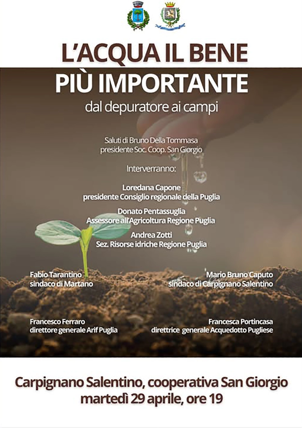 I lavori saranno ufficialmente presentati presso la Sala Conferenza della Cooperativa San Giorgio in Carpignano (S.P. 48) martedì 29 aprile alle ore 19, alla presenza della presidente del Consiglio regionale Loredana Capone, accompagnata dall’assessore Donato Pentassuglia, dal responsabile delle Risorse Idriche Andrea Zotti, dalla direttrice di Aqp Francesca Portincasa, dal direttore generale di Arif Francesco Ferraro e dai sindaci dei due comuni interessati.