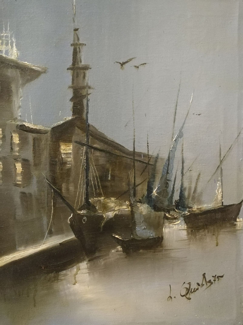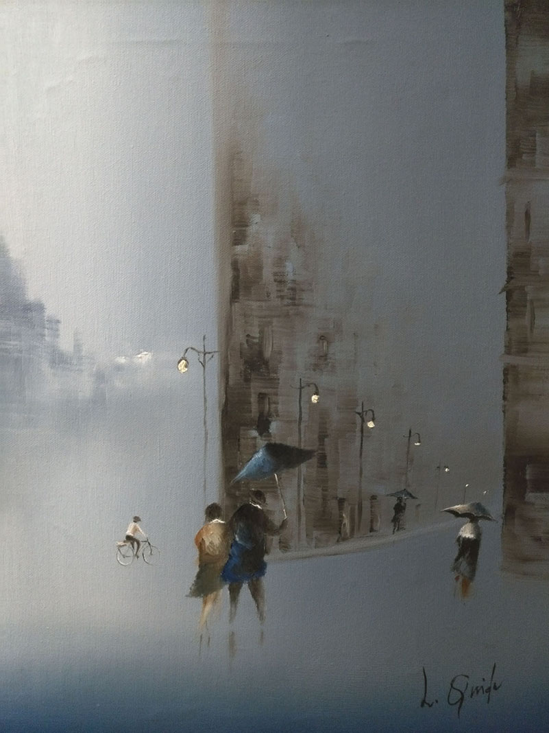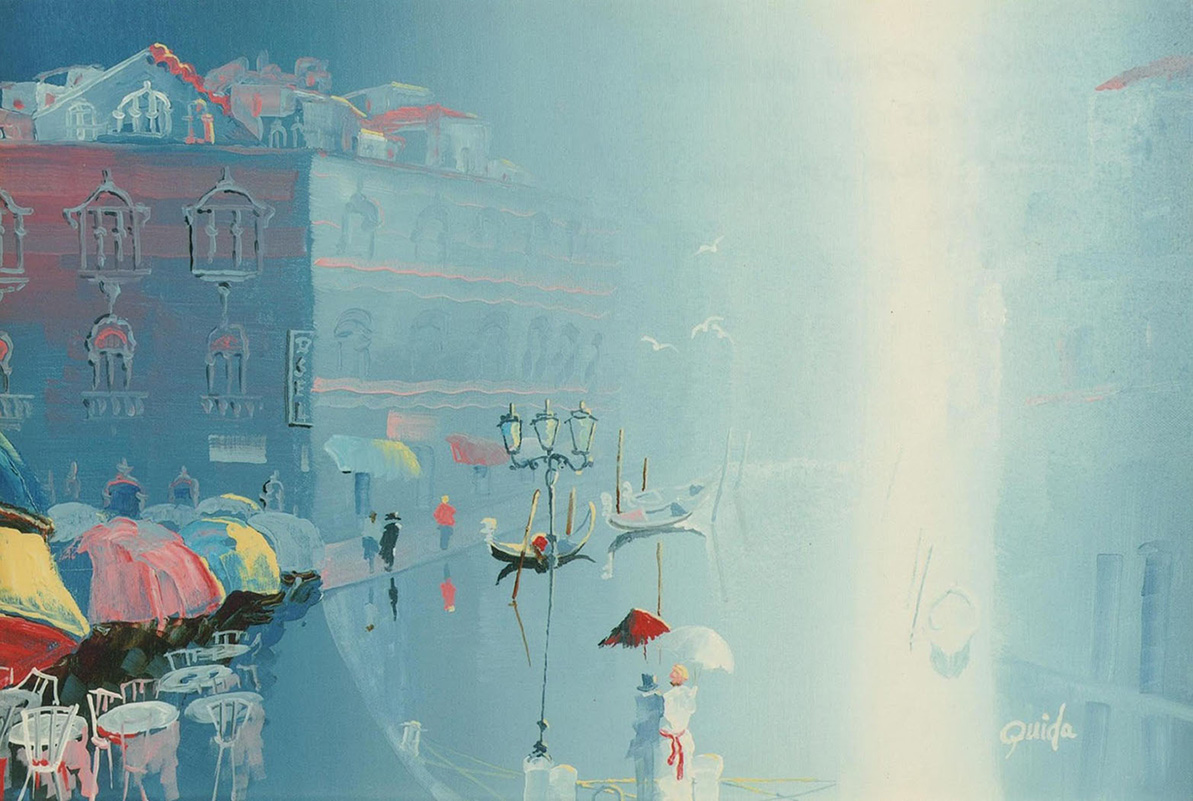 Le innumerevoli minuscole figure, dalle forme appena abbozzate con la punta del pennello e mai accuratamente descritte, dai vestiti variamente colorati, rendono bene l’animazione dei luoghi che rimangono sempre indeterminati (Parigi, Venezia…?) reinventati attraverso la soggettività dell’artista e liberamente visualizzati sulla tela. Però, la sua attenzione non è mai rivolta alle facili vedute panoramiche delle città e degli ambienti rappresentati, ma solo ad alcuni aspetti, resi originali dalla competenza compositiva e dalla solida padronanza nell’uso espressivo del colore.