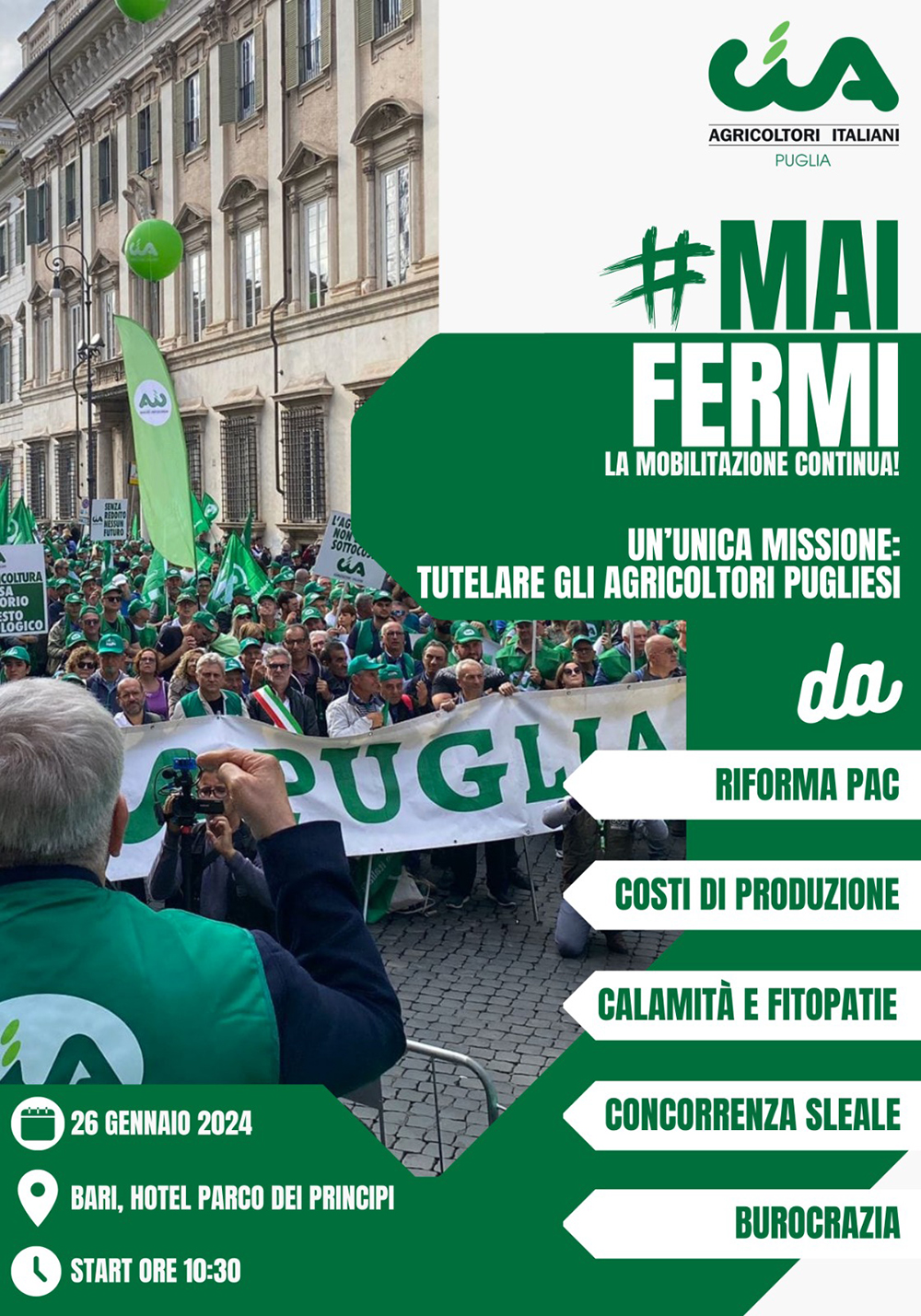 È Gennaro Sicolo, presidente di CIA Puglia e vice presidente nazionale di CIA Agricoltori Italiani, ad annunciare con queste parole l’incontro-assemblea con gli agricoltori pugliesi a Bari per venerdì 26 gennaio, alle ore 10.30, presso l’Hotel Parco dei Principi.