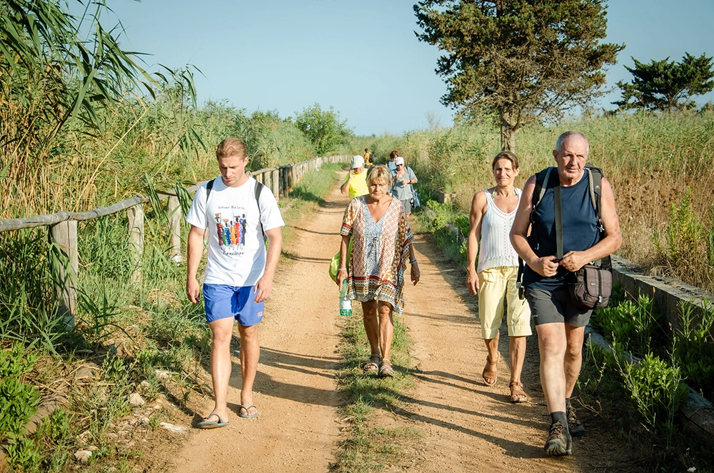 Si cammina lentamente sulla sabbia, lungo i canali, intorno ai bacini, sui gradoni rocciosi delle serre di Ugento, con soste per ascoltare i racconti e osservare le peculiarità dell’area protetta che copre 1600 ettari, lungo 12 chilometri di costa, con una sorprendente ricchezza di specie e ambienti. Dai campi recintati con i muretti a secco alle zone umide con bacini artificiali e canali, dalla pineta e macchia mediterranea fino alle dune costiere.