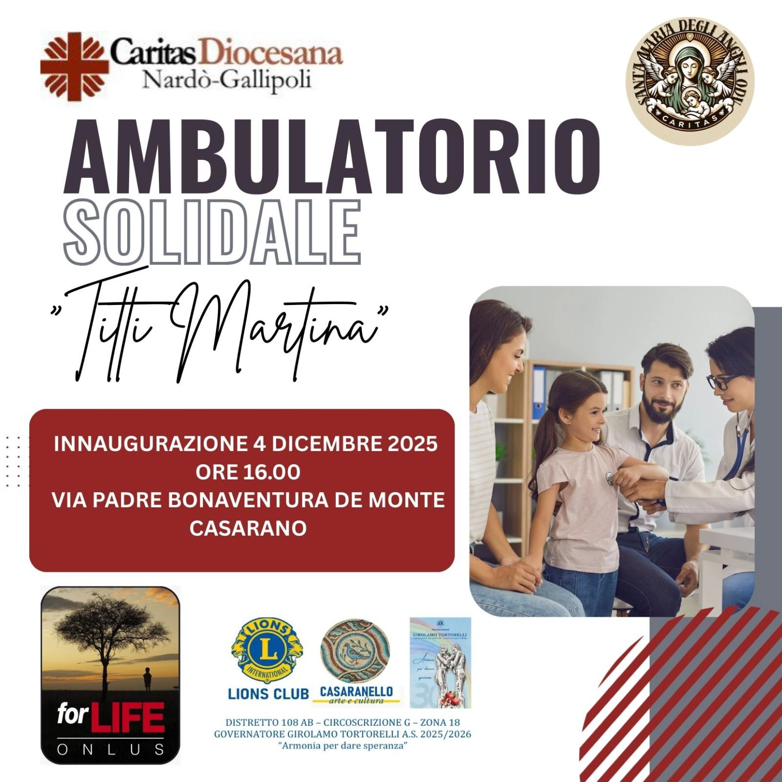 Un nuovo strumento contro la povertà sanitaria L’ambulatorio “Titti Martina” è il primo di due ambulatori solidali che la Diocesi di Nardò-Gallipoli sta attivando per rispondere all’aumento delle situazioni di fragilità economica aggravate da problemi di salute.