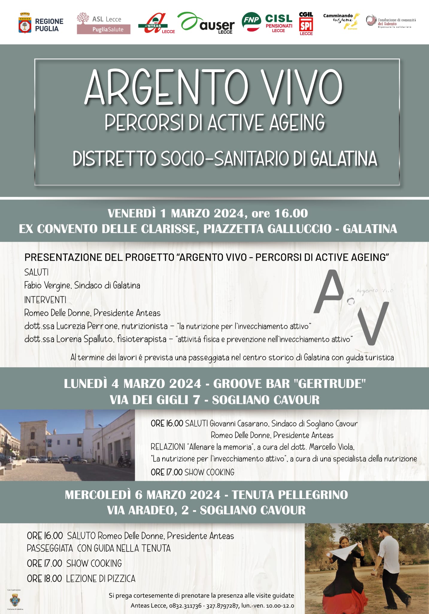 Prosegue con il terzo appuntamento a Galatina, tenendo ben saldo il principio espresso da Rita Levi Montalcini, il progetto di invecchiamento attivo Argento vivo, percorsi di active ageing, costituito dalla rete di partenariato composta da Anteas Lecce, Cisl Fnp Lecce, Spi Cgil Lecce, Auser Lecce, Gruppo di Cammino ‘Camminando…Insieme’, Fondazione di Comunità del Salento nell’ambito dell’Avviso Pubblico emanato per la presentazione di specifici progetti di prevenzione sul territorio della Asl di Lecce finalizzati alla promozione e valorizzazione dell’invecchiamento attivo e della buona salute.