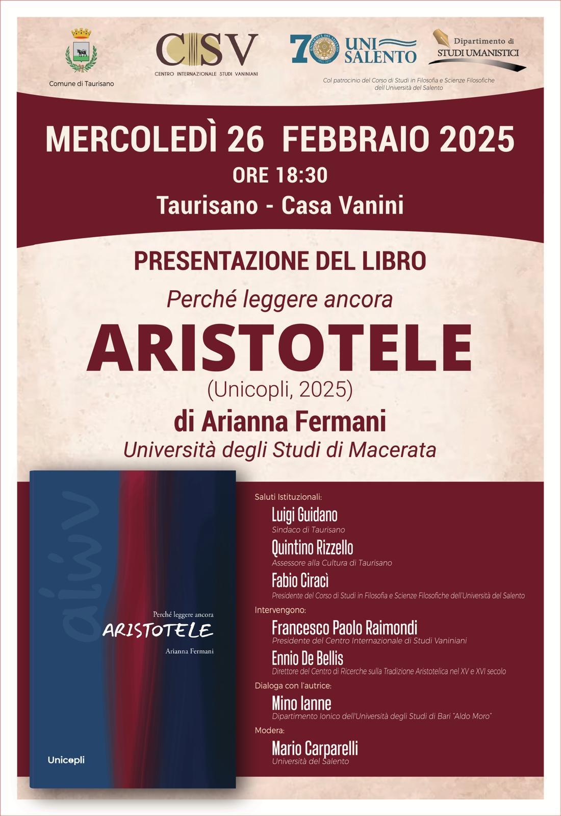 In occasione della pubblicazione del suo nuovo libro “Perché leggere ancora Aristotele”, Arianna Farmani farà tappa in prima nazionale a Taurisano, presso Casa Vanini.