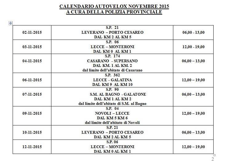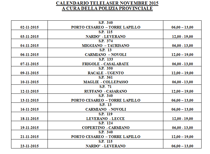 Ricordando agli utenti della strada l’importanza della prudenza alla guida e dell’utilizzo di cinture di sicurezza in auto e di caschi in moto, la polizia provinciale rende pubblici i calendari dei controlli sulle strade provinciali che saranno effettuati tramite autovelox, telelaser e postazioni fisse, nel mese di novembre.