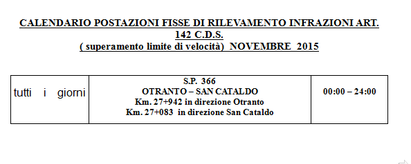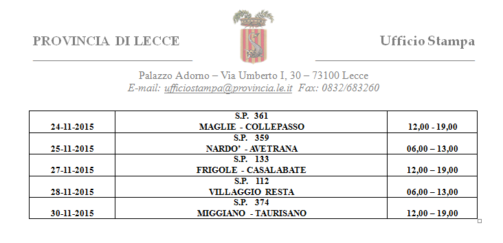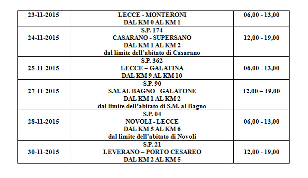| S.P. 04 | Lecce – Novoli | Km 5+760 direzione Lecce | 00:00 – 24:00 |