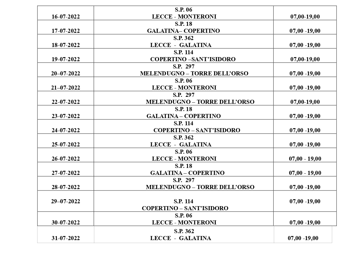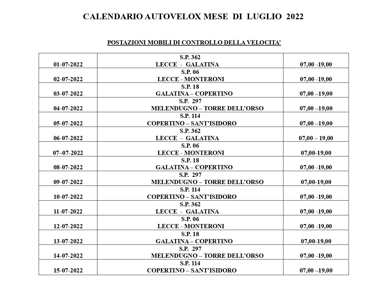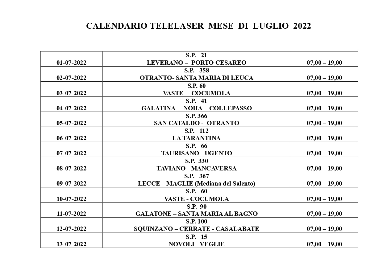 Sono disponibili i calendari dei controlli sulle strade provinciali che saranno effettuati dalla Polizia provinciale, tramite autovelox, telelaser e postazioni fisse, nel mese di luglio 2022