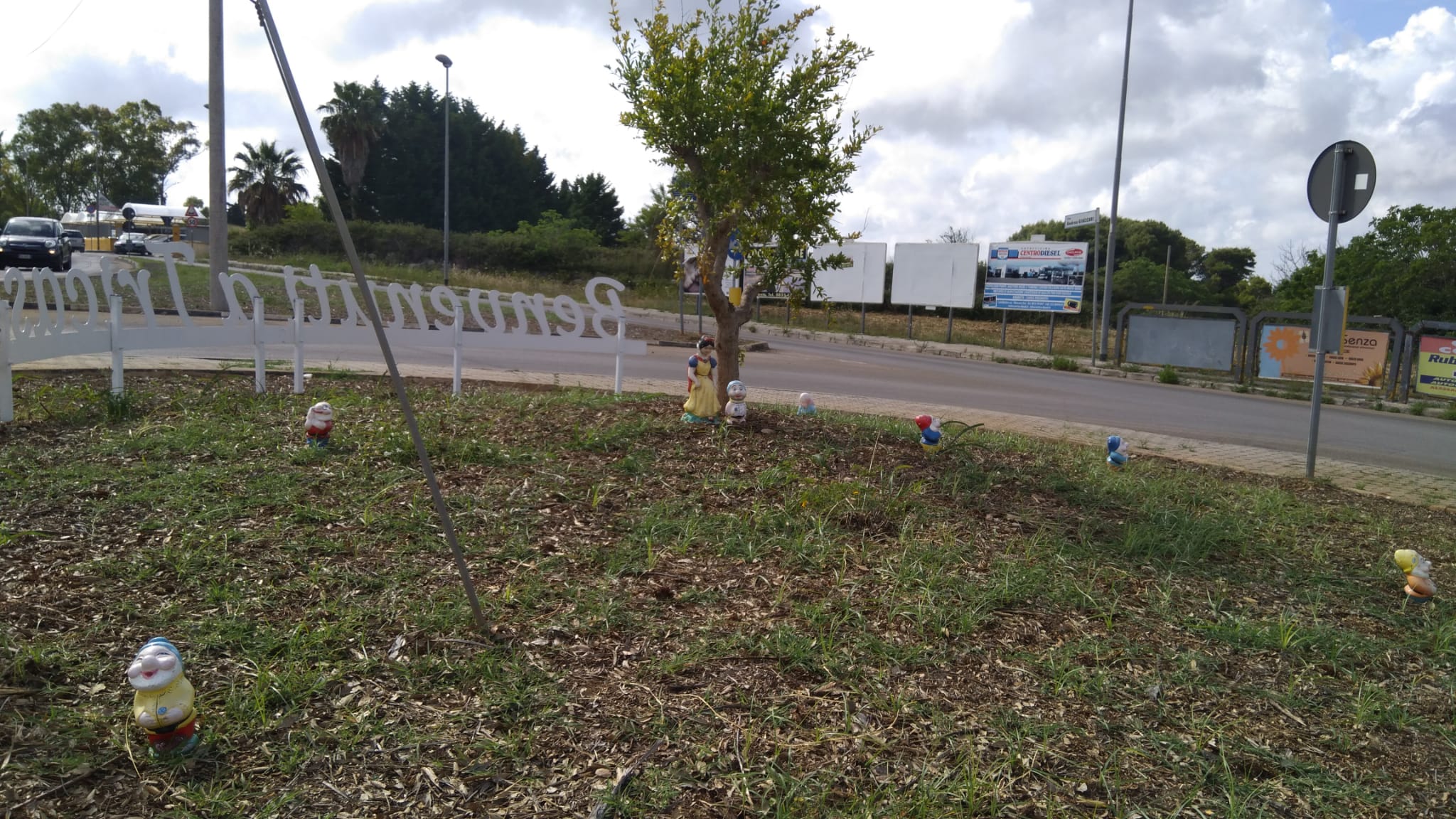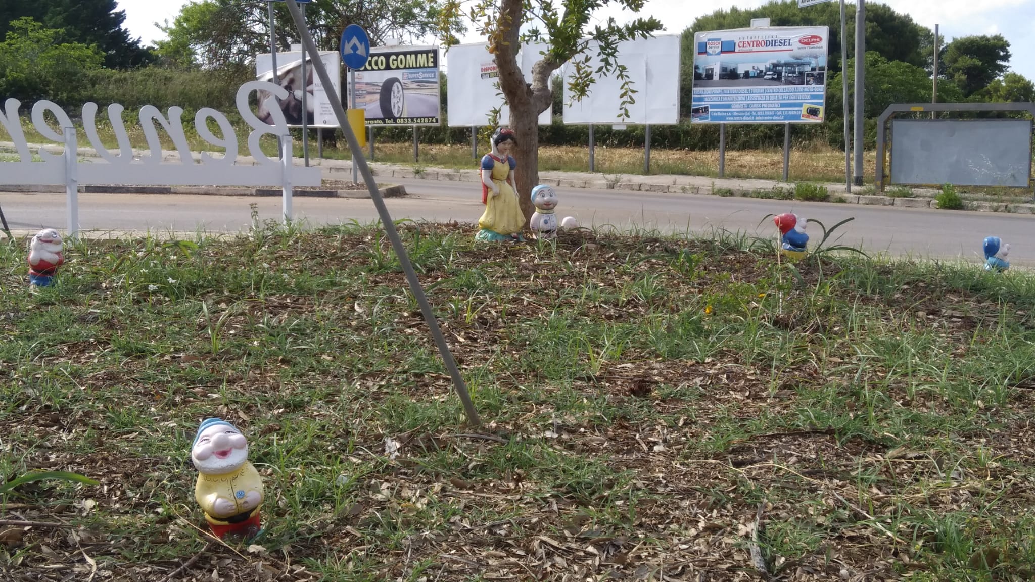 Insieme alla solita scritta “Benvenuti a Tricase” che accoglie chi arriva ad ogni ingresso del paese oggi nell’erbaccia ricresciuta, hanno fatto capolino… Biancaneve e i sette nani, uno più vicino e gli altri disseminati nell’aiuola.
