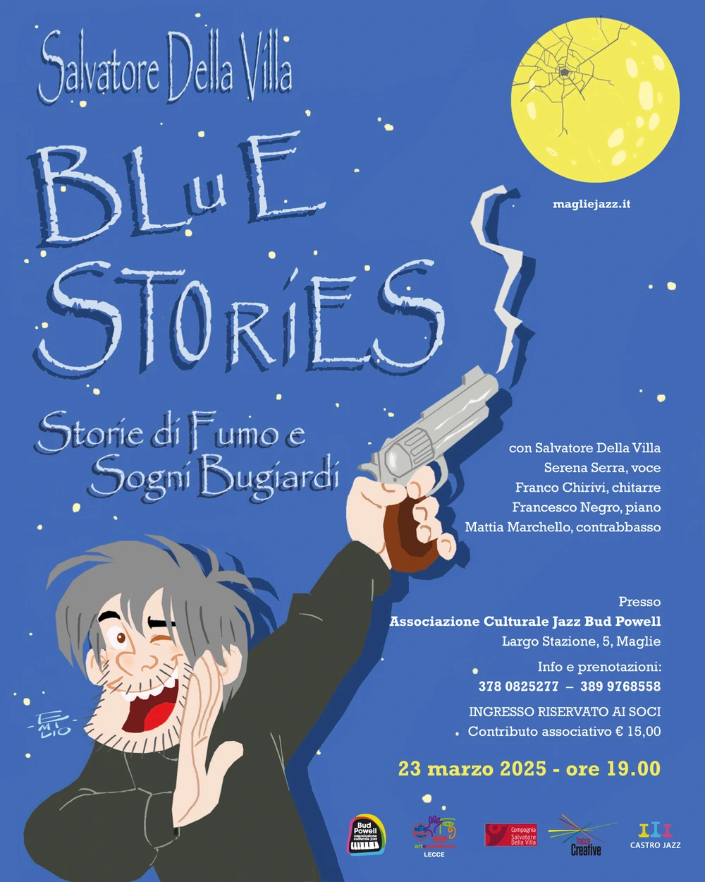 Prossimo appuntamento della sezione Teatro sarà domenica 23 marzo, con sipario alle ore 19, con spettacolo BLUE STORIES Storie di Fumo e Sogni Bugiardi con Salvatore Della Villa, voce Serena Serra, chitarre Franco Chirivì, pianoforte Francesco Negro, contrabasso Mattia Marchello.