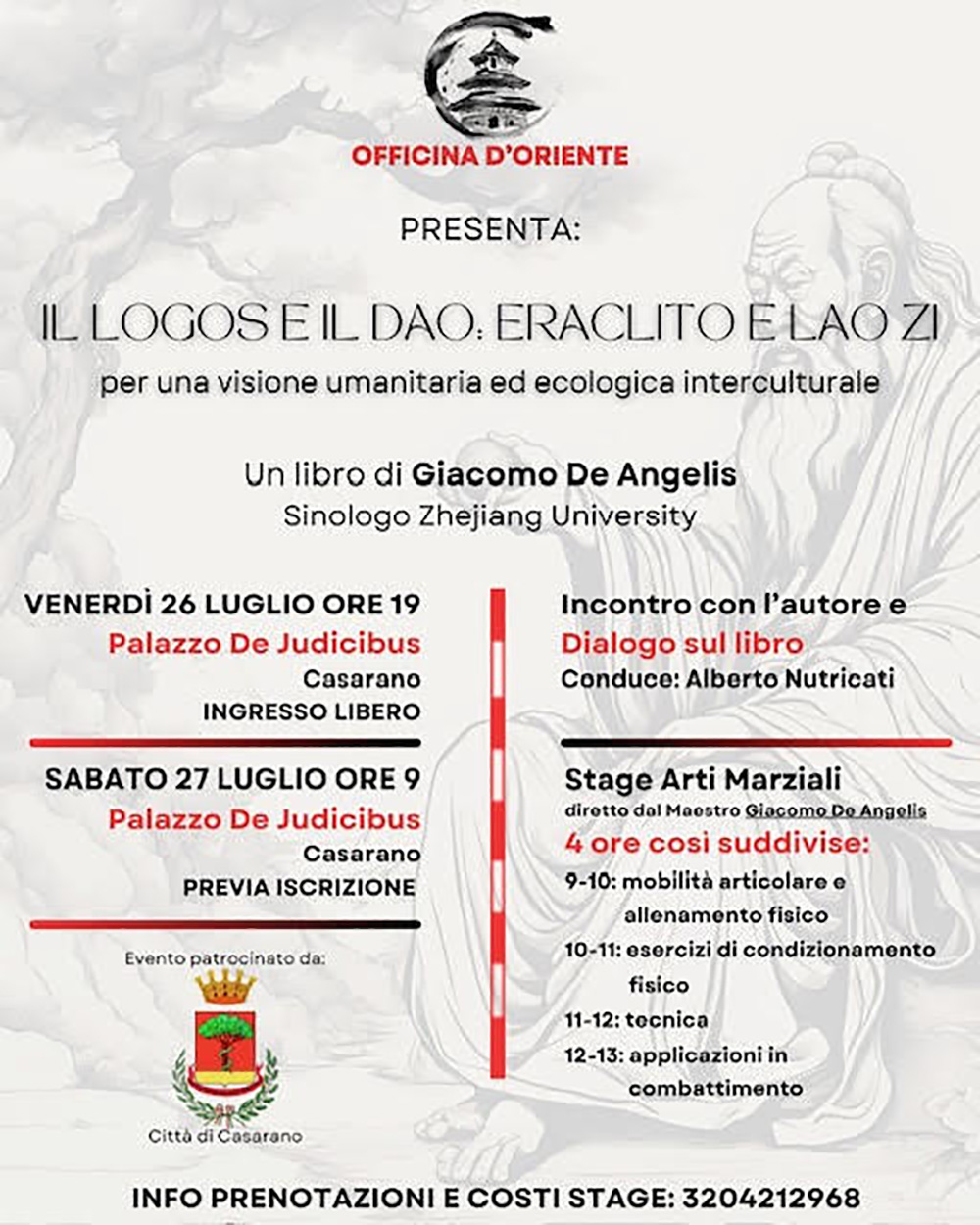 Il doppio appuntamento casaranese assumerà un aspetto di originalità sabato 27 luglio, sempre presso il Palazzo De Judicibus quando, a partire dalle ore 9e sino alle 13, si terrà un workshop aperto a tutti (previa iscrizione) e rivolto soprattutto ai cultori di arti marziali, nel quale De Angelis, forte dei suoi studi e dei quindici anni vissuti in Cina a stretto contatto quotidiano con grandi Maestri (allievo diretto del Maestro Sui Yunjiang per lo stile Meihuaquan e del Maestro Cen Neng per il Wing Chun), approfondirà temi concreti e sicuramente interessanti come la mobilità articolare e l’allenamento fisico, esercizi di condizionamento fisico, tecnica, sino alle applicazioni in combattimento.