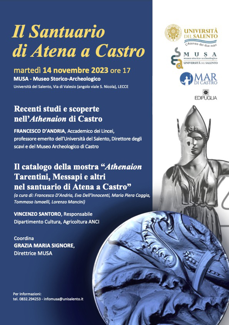 Nel corso della presentazione al MUSA interverrà Francesco D’Andria, Accademico dei Lincei, professore emerito dell’Università del Salento e Direttore degli scavi e del Museo Archeologico di Castro, per illustrare le nuove importanti acquisizioni delle ricerche condotte presso il Santuario di Atena.