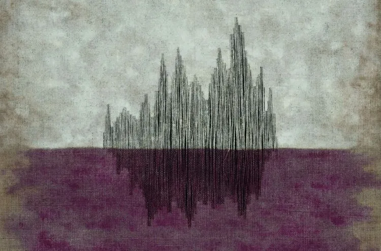A colpire l’attenzione è la tecnica di realizzazione: il colore appare materico, privo di lucentezza, quasi secco e la trama della tela è sapientemente privata di alcune porzioni dei fili posti in orizzontale, che danno forma e forza all’immagine caratterizzata solo da quelli posti in verticale e dal contrasto ottenuto dalla sistemazione di un tessuto nero dietro la tela.