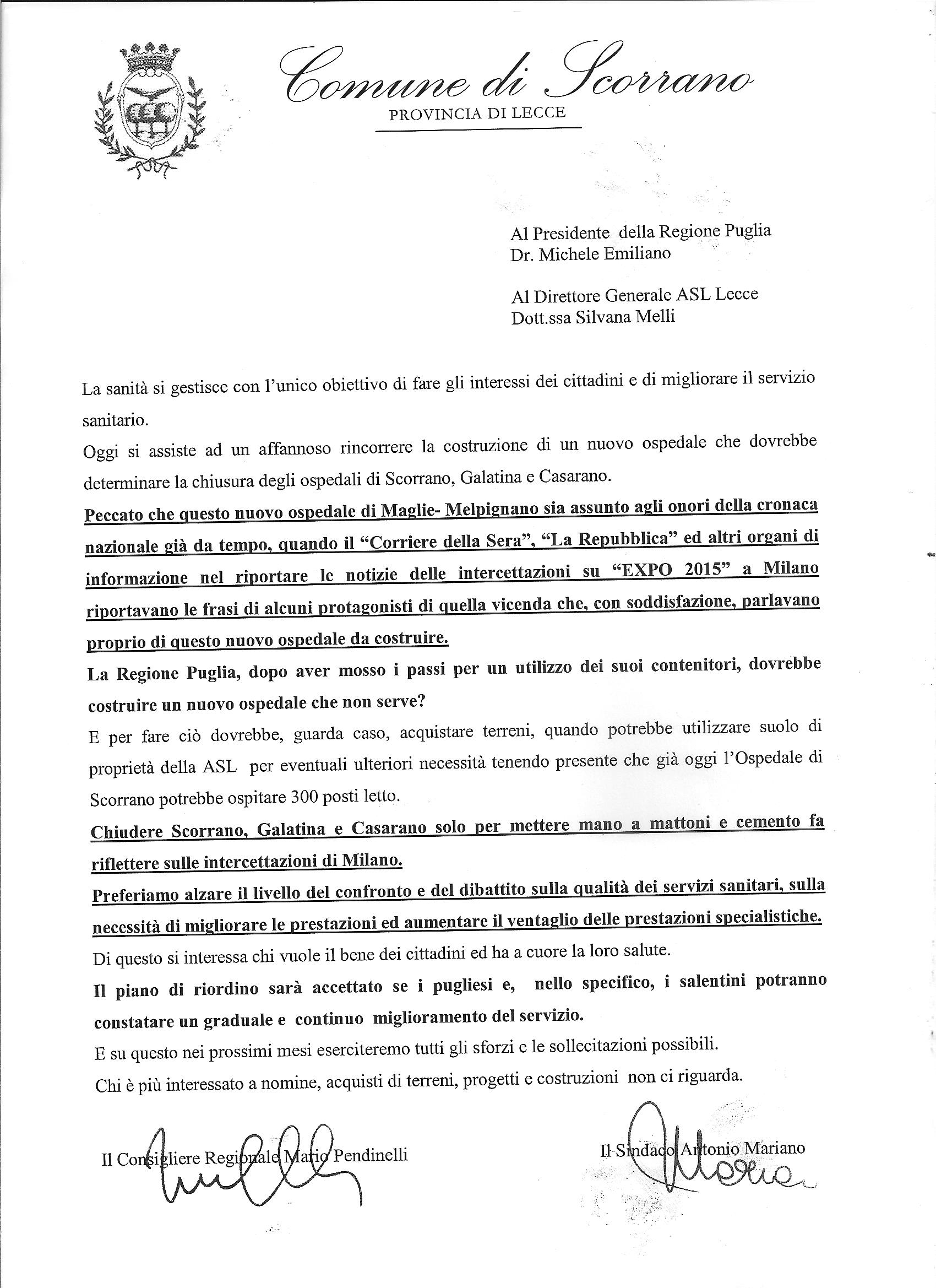 Il consigliere regionale Mario Pendinelli ed il sindaco di Scorrano Antonio Mariano scrivono al presidente della Regione Puglia Michele Emiliano ed al direttore generale dell’Asl di Lecce Silvana Melli.