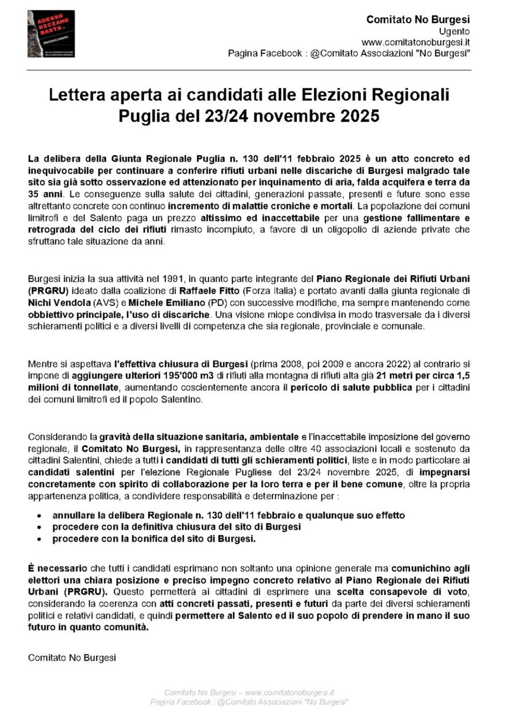 In vista delle elezioni regionali del 23 e 24 novembre , il Comitato No Burgesi ha inviato una lettera aperta a tutti i candidati delle varie liste elettorali, chiedendo una presa di posizione chiara e concreta sulla gestione dei rifiuti in Puglia e, in particolare, sulla vicenda della discarica di Burgesi.