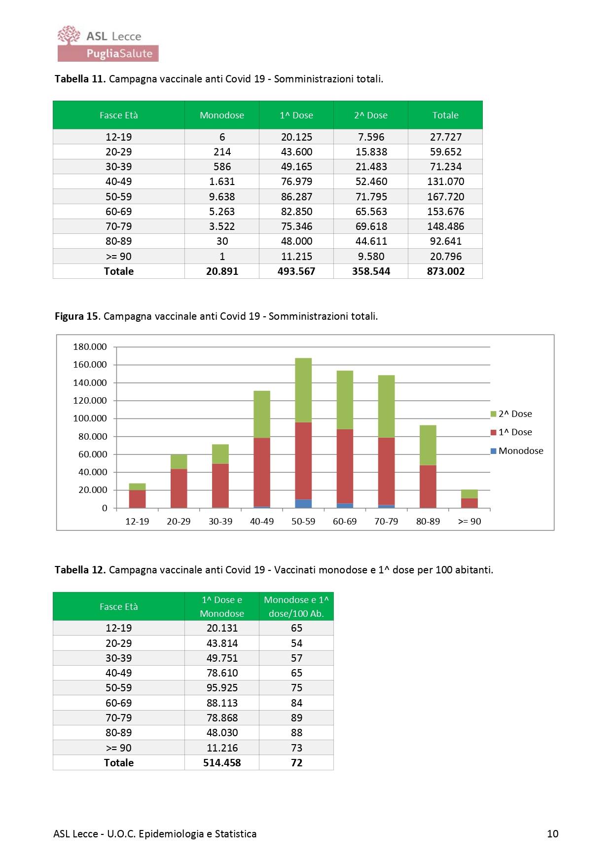 Sono 873.002 le dosi di vaccino somministrate finora a cittadini residenti in ASL Lecce, di cui 493.567 prime dosi, 358.544 seconde dosi e 20.891 monodose.