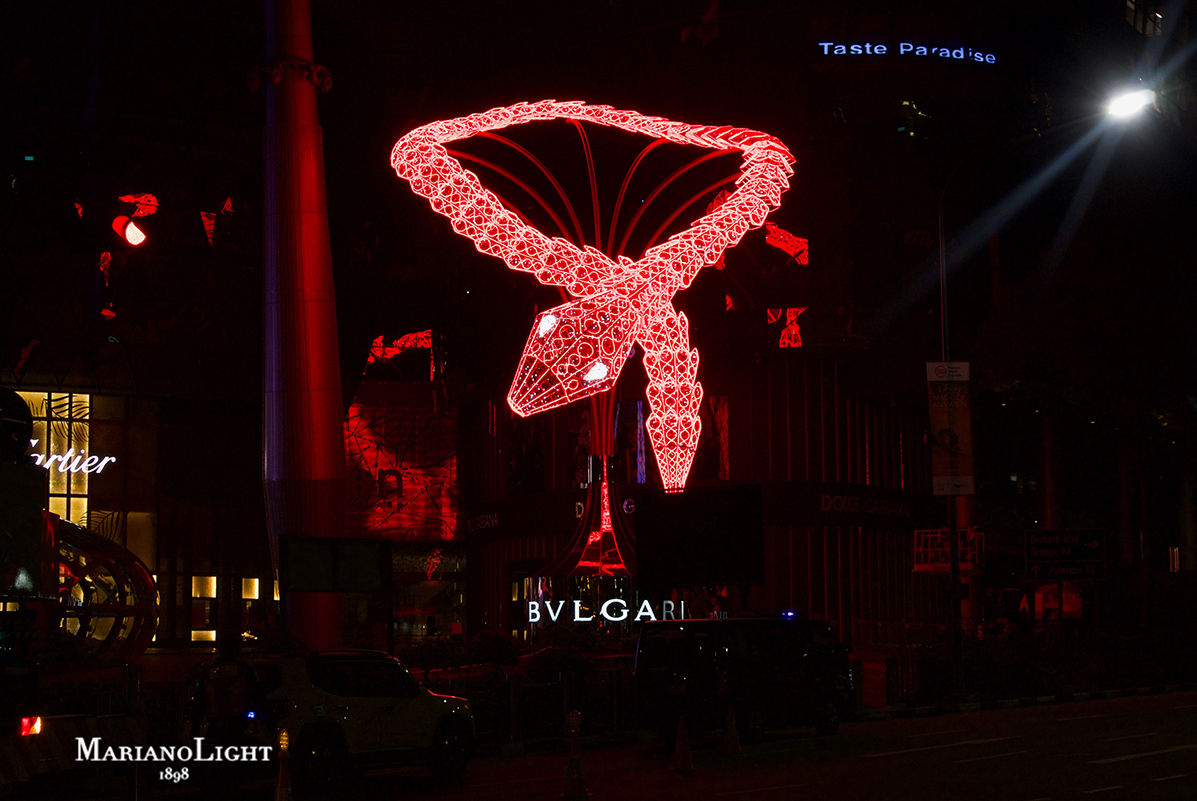 Cerimonia ufficiale di accensione a Singapore al famosissimo centro commerciale ION Orchard, dove l’Albero Fireworks e la collana Serpenti, prodotti da Marianolight per la Città di Singapore, sono stati illuminati per la prima volta da alcune importanti personalità locali.