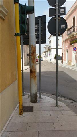 pericolosissimo, “arricchito” fino a qualche mese fa anche del palo semaforico, ormai superato dai nuovi sensi di marcia e rimosso a seguito delle tante segnalazioni per il suo precario stato di tenuta, come andrebbe fatto con i pali semaforici, ormai arrugginiti, agli altri due angoli dell’incrocio“.