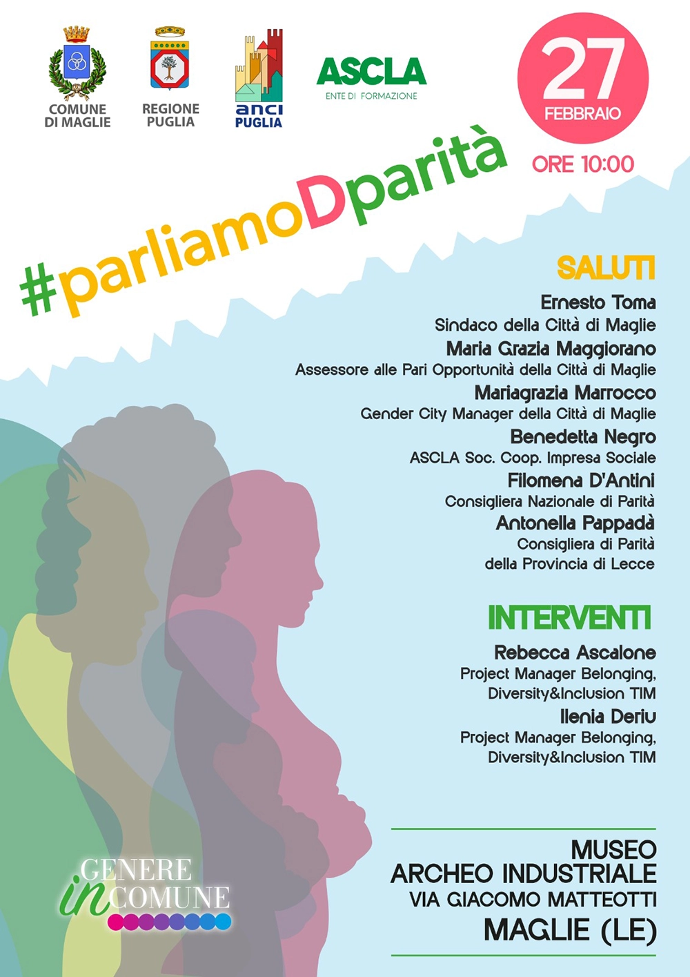 Momento di bilancio e rilancio a Maglie, dove giovedì 27 febbraio si terrà l’evento #parliamoDparità, organizzato dal comune in collaborazione con ASCLA – Ente di Formazione nell’ambito dell’iniziativa regionale “Genere in Comune”, promossa da Regione Puglia e ANCI Puglia.