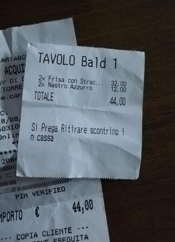 Il resto della storia lo fa lo scontrino: 32 euro per due frise. Non saranno state due semplici frise al pomodoro, per carità, ma nemmeno caviale e champagne.