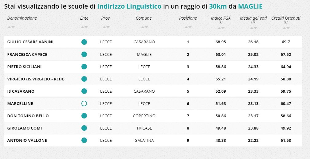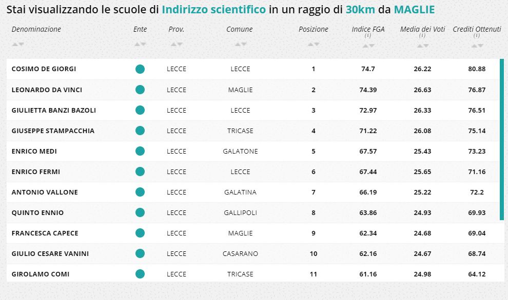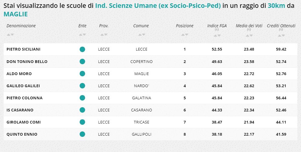 Quale scuola superiore scegliere dopo la terza media? La Fondazione Agnelli ha rilevato i migliori istituti in tutta Italia. Nel Salento due scuole di Lecce si confermano ai vertici dei licei: Il “Palmieri” per l’indirizzo Classico e il “De Giorgi” per lo Scientifico. Il “Vanini” di Casarano è il miglior Linguistico, mentre il “Siciliani” di Lecce è la scuola con il punteggio più alto tra quelle a indirizzo Socio Psico Pedagogico. Tra gli istituti a indirizzo economico sul podio c’è il “Cezzi De Castro” di Maglie, mentre per l’indirizzo Tecnologico, ha la migliore classifica “Antonio Meucci” di Casarano.