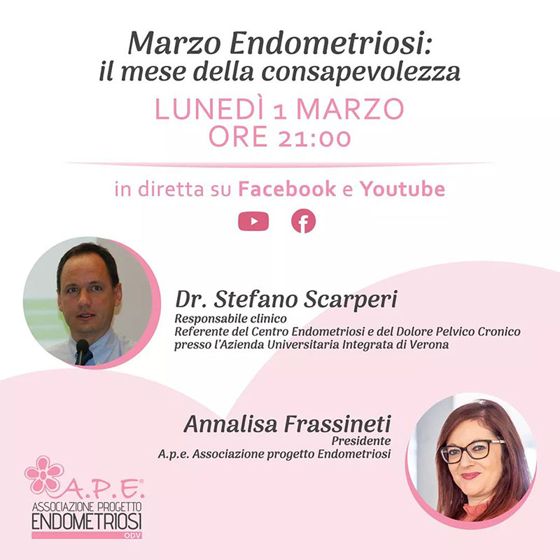 «Tra le tante attività in programma questo mese», sostiene la presidente Annalisa Frassineti, «saremo presenti su Facebook e Youtube con dirette dedicate ogni volta a uno specialista diverso. L’1 marzo saremo in compagnia del dottor Stefano Scarperi e con lui parleremo di adenomiosi, un problema che tante donne hanno, ma che a oggi non ha cure risolutive e può portare ad avere dolori lancinanti oltre che essere una delle cause di infertilità».