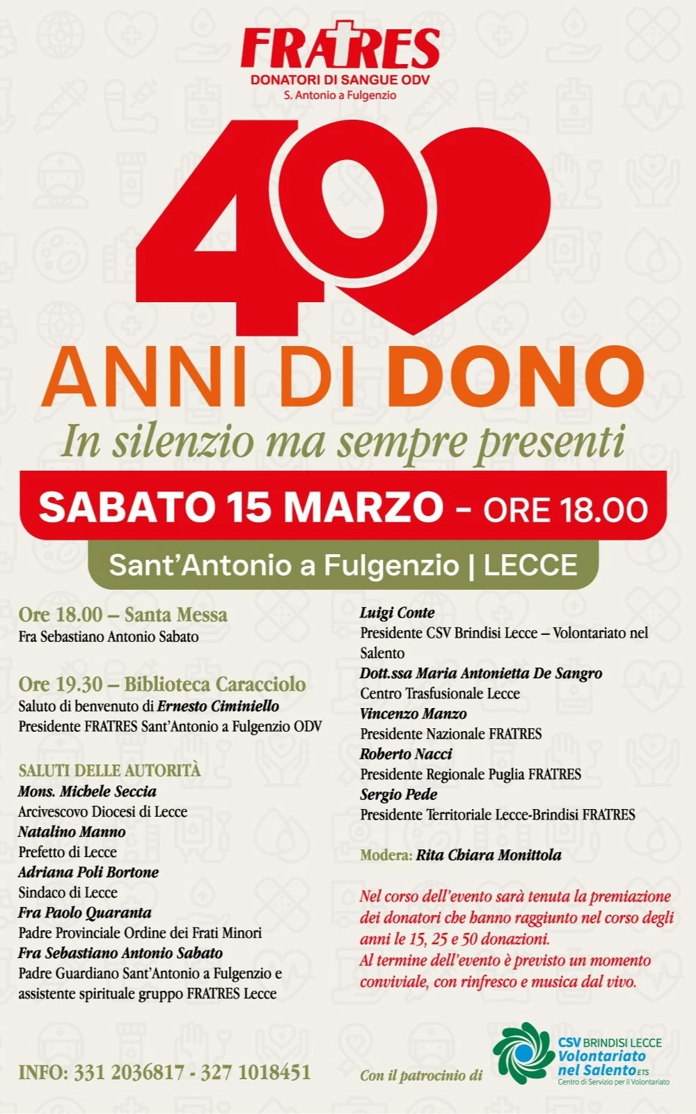 La giornata di sabato 15 marzo vuole riconoscere questo peso. Si parte alle 18 con la Santa Messa, celebrata da fra Sebastiano Antonio Sabato, a sottolineare il valore della donazione come atto di generosità e amore per il prossimo, presso la Chiesa di Sant’Antonio a Fulgenzio.