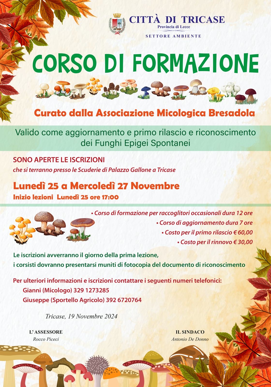 L’Associazione Micologica Bresadola (Sezione di Tricase) e la Città di Tricase, settore Ambiente, con la fattiva collaborazione di Giuseppe Elia, responsabile dello Sportello Agricolo, hanno organizzato un corso di formazione per il rilascio del patentino per la raccolta dei funghi.