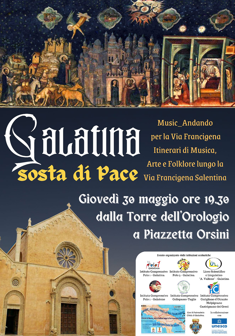In questa ricerca della tradizione, con la voglia di percorrere un cammino comune, l’ufficio scolastico regionale della Puglia Ufficio VI di Lecce ha promosso la rassegna territoriale “Music_Andando per la Via Francigena”, itinerari di musica, arte e folklore lungo la via francigena salentina, per cercare di riscoprire il senso di quel cammino ed esaltare la gioiosa festa di musica delle scuole ricadenti lungo quei cammini.