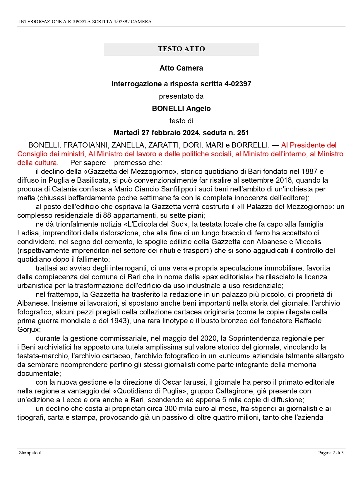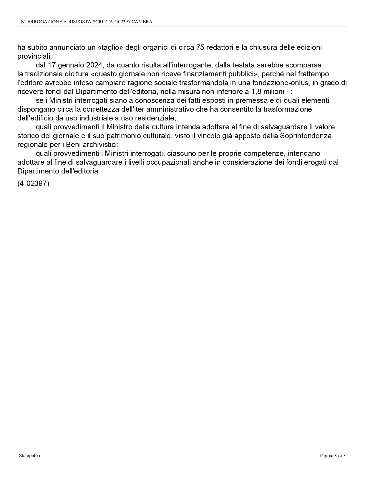 Una interrogazione del gruppo parlamentare, Alleanza Verdi Sinistra a firma Bonelli Fratoianni, Zanella, Zaratti, Dori, Mari e Borrelli, che chiedono ai ministri competenti quali siano state le motivazioni reali della decisione di ridurre drasticamente i livelli occupazionali e prevedere la chiusura delle sedi decentrate a fronte di contributi pubblici erogati ai gestori della storica testata dal Dipartimento dell’Editoria.