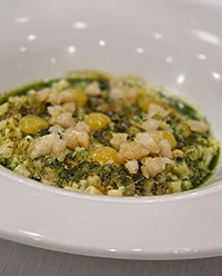 A cottura ultimata, mantecare con il burro acido, che donerà struttura e rotondità, e con il burro alle erbe, dal profilo balsamico e aromatico.