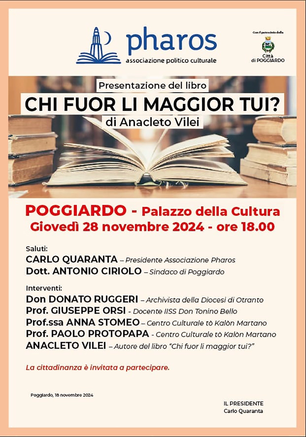 Oltre all’autore Anacleto Vilei, vi parteciperanno: Carlo Quaranta, presidente dell’associazione Pharos che ha organizzato l’evento; Antonio Ciriolo, sindaco di Poggiardo; i relatori Don Donato Ruggeri, archivista della Diocesi di Otranto, Giuseppe Orsi, docente del Liceo Artistico di Poggiardo, Anna Stomeo e Paolo Protopapa del Centro Culturale Tò Kalòn di Martano.