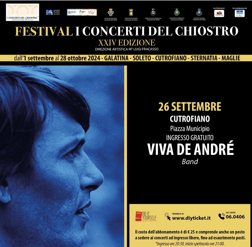 Continua ospitando lo spettacolo musicale Viva De Andrè la XXIV edizione del Festival I Concerti del Chiostro, la rassegna musicale dell’autunno salentino con la direzione artistica di Luigi Fracasso.