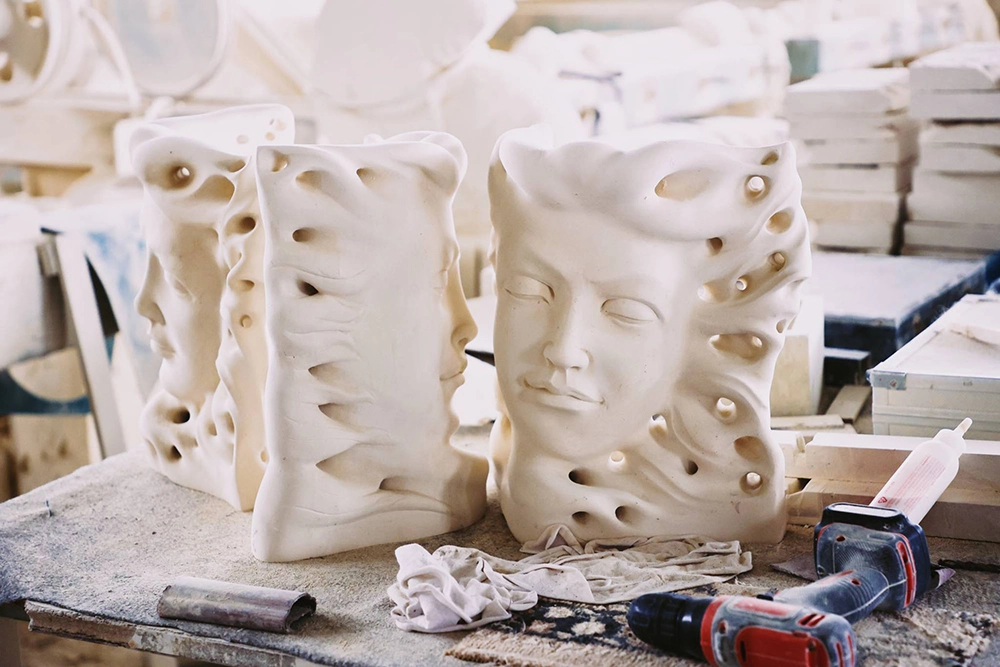 Per sottrazione della materia, le forme definiscono il contenitore, attraverso una lavorazione della pietra con macchine a controllo numerico.