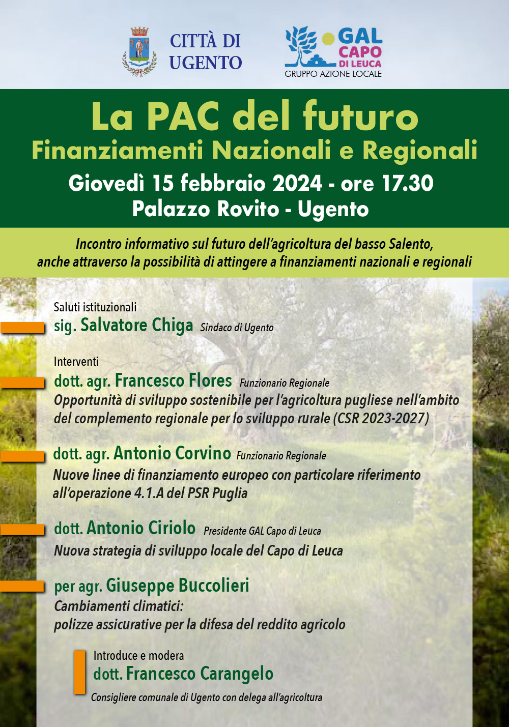 Il programma dell’incontro, introdotto e moderato da Francesco Carangelo, consigliere comunale di Ugento con delega all’agricoltura, prevede i saluti istituzionali di Salvatore Chiga, sindaco di Ugento e una serie di interventi: l’agronomo Francesco Flores, funzionario regionale, parlerà di “Opportunità di sviluppo sostenibile per l’agricoltura pugliese nell’ambito del complemento regionale per lo sviluppo rurale (CSR 2023-2027)”; l’agronomo Antonio Corvino, funzionario regionale, relazionerà sulle “Nuove linee di finanziamento europeo con particolare riferimento all’operazione 4.1.A del PSR Puglia”; Antonio Ciriolo, presidente del GAL Capo di Leuca, illustrerà la “Nuova Strategia di Sviluppo Locale del Capo di Leuca”; il perito agrario, Giuseppe Buccolieri, interverrà sui: “Cambiamenti climatici: polizze assicurative per la difesa del reddito agricolo”.