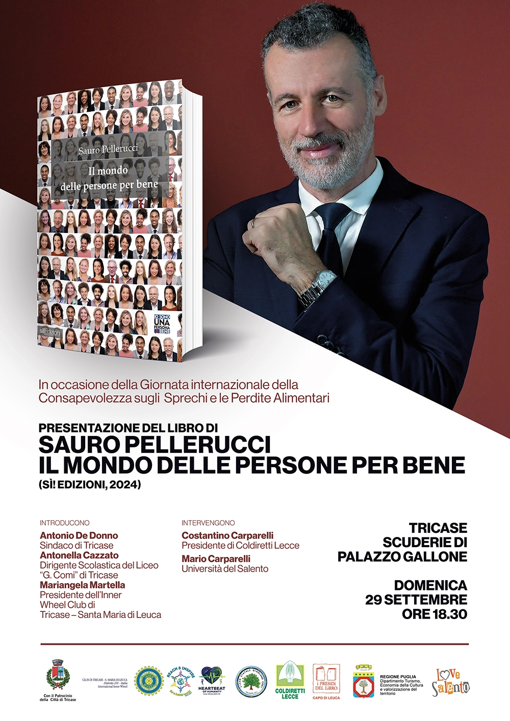 A seguire, Pellerucci dialogherà con Costantino Carparelli (presidente di Coldiretti Lecce) e Mario Carparelli (Università del Salento) sui temi affrontati nel suo libro “Il mondo delle persone per bene” (Sì! Edizioni), pubblicato recentemente, il quale si propone come un “manifesto del bene” che, in contrasto con l’attuale panorama mediatico dominato da pessimismo e sfiducia, offre una visione positiva dell’umanità, evidenziando le azioni di chi, ogni giorno, si impegna per il bene comune.