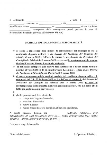 Ecco il nuovo modello da compilare per gli spostamenti necessari (solo per validi motivi)