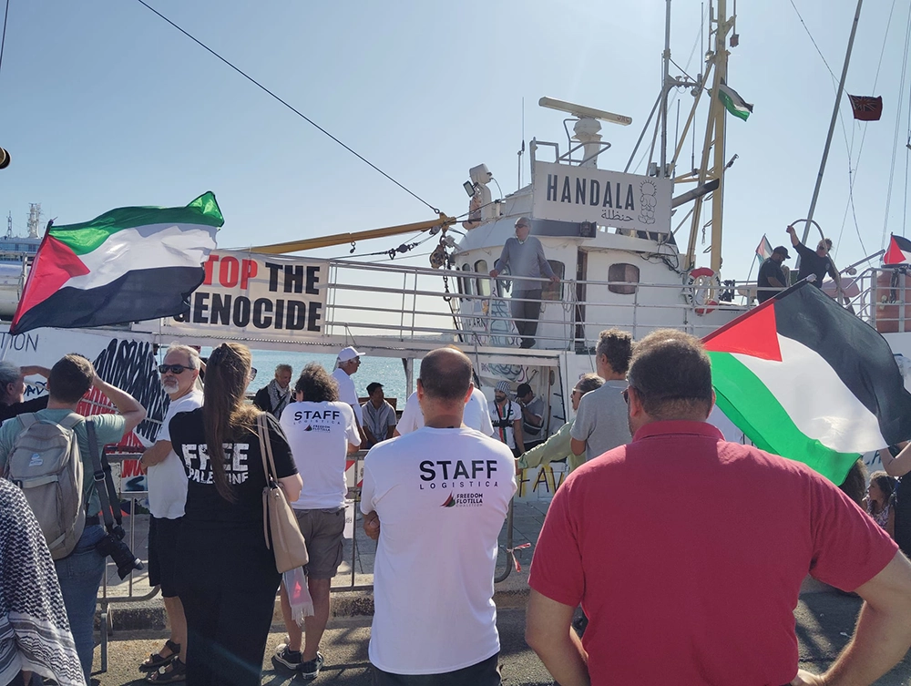 Al molo è stata accolta da Shokri Al Hroub, responsabile logistico della coalizione, e da decine di persone giunte sul posto per manifestare la propria solidarietà nei confronti della popolazione palestinese con striscioni e bandiere e per sostenere attivamente la missione, dopo l’assedio ai danni dell’altra imbarcazione, la Madleen, attaccata lo scorso giugno delle forze israeliane in acque internazionali.