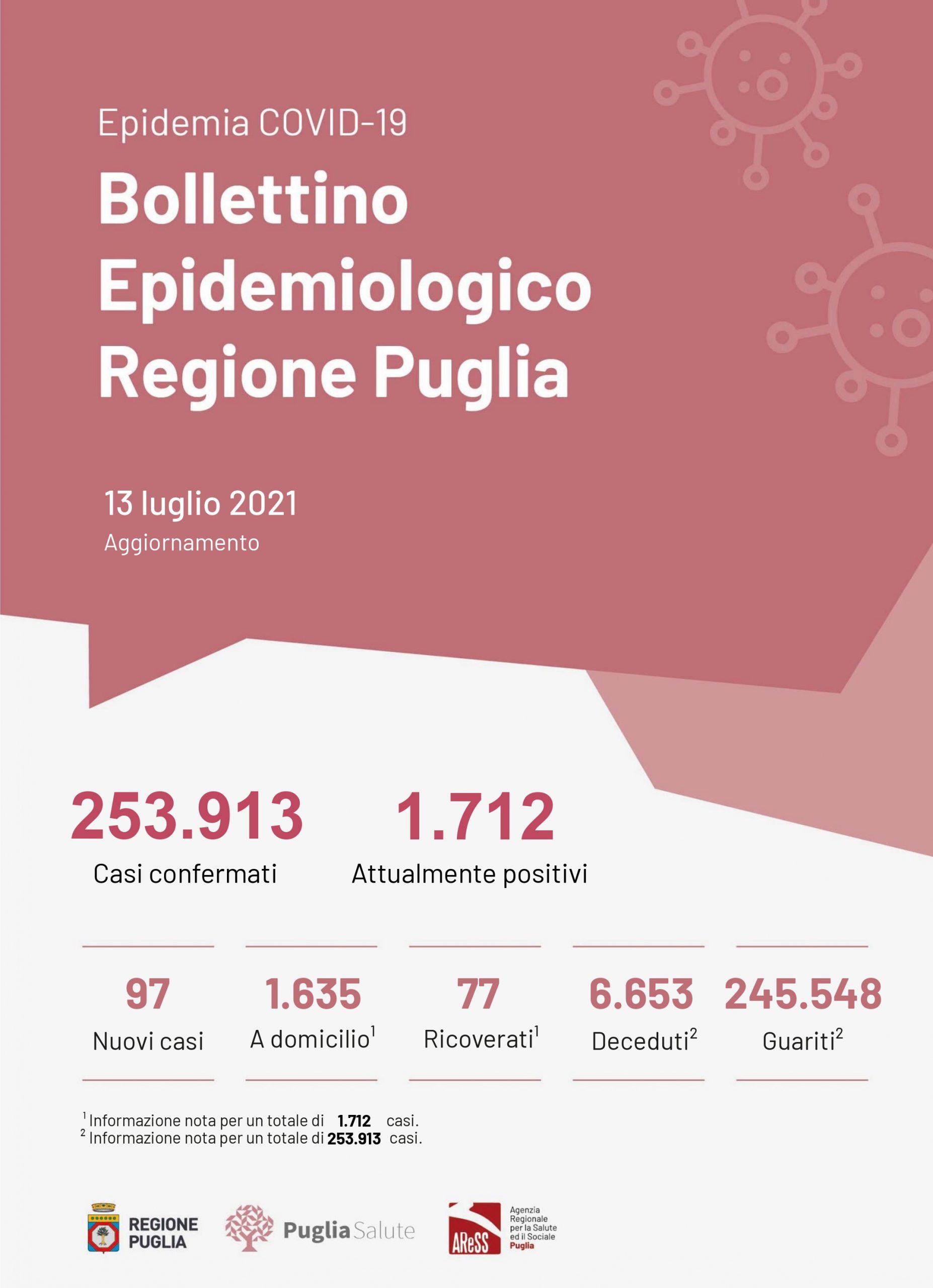 Sono 97 casi i nuovi casi in Puglia con un tasso di positività dell’1,28 % (ieri era dello 0,43%). In provincia di Lecce sono 39 nuovi positivi (+30 rispetto a ieri)