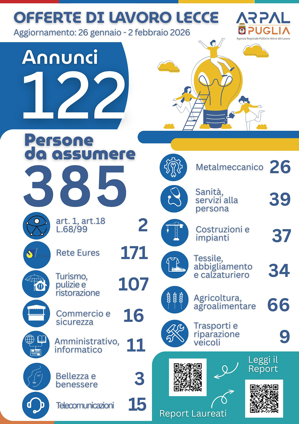 Intanto, il 4° Report 2026 delle offerte di lavoro di ARPAL Puglia fotografa un mercato occupazionale in movimento, con 122 offerte attive per un totale di 385 posizioni aperte.