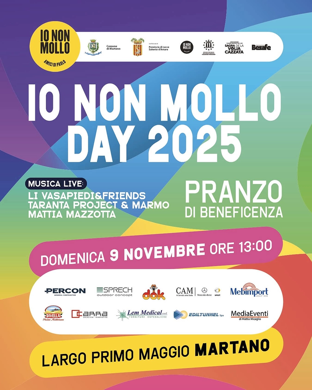 Fabio Tarantinopresidente facente funzioni della Provincia di Lecce e sindaco di Martano, ha sottolineato il valore di una comunità che sa farsi rete: «Io Non Mollo Day è la dimostrazione più autentica di cosa significhi fare comunità. Martano e tutto il Salento si stringono ogni anno attorno a un messaggio di forza e di speranza che va oltre i confini del nostro territorio. La Provincia di Lecce è orgogliosa di sostenere un’iniziativa che unisce solidarietà, cultura e impegno civile, in memoria di Paolo e nel segno di un bene condiviso».