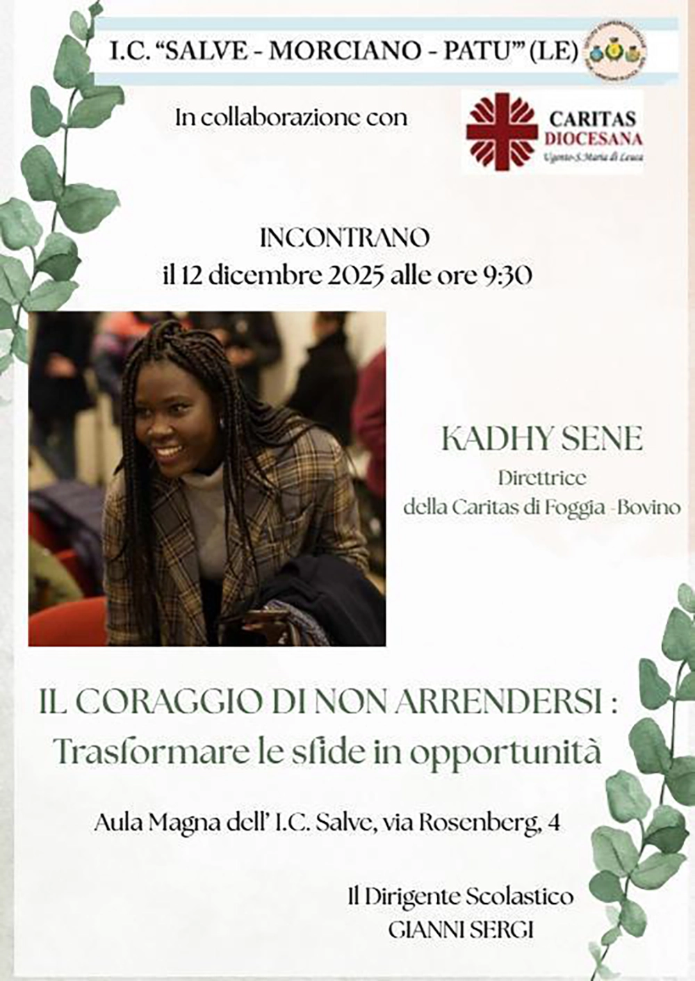 Il dirigente scolastico Istituto comprensivo di Salve Morciano Patù accoglie la nuova direttrice Caritas: «Siamo convinti che l’incontro con Kadhy Sene rappresenti un momento prezioso per offrire ai nostri studenti una prospettiva diretta sulle sfide del territorio e sull’importanza di essere un aiuto concreto nella comunità. L’obiettivo è quello di consolidare il messaggio di forza, resilienza e responsabilità sociale. Ascoltare la sua testimonianza significa educare al cuore della cittadinanza attiva: comprendere le realtà di fragilità e imparare che, a tutte le età, possiamo e dobbiamo fare la nostra parte per un mondo più giusto e inclusivo. L’appuntamento di domani», conclude Gianni Sergi, «si pone in stretta continuità con l’iniziativa tenutasi là scorsa settimana che ha celebrato figure femminili di forte impatto sociale e civile».