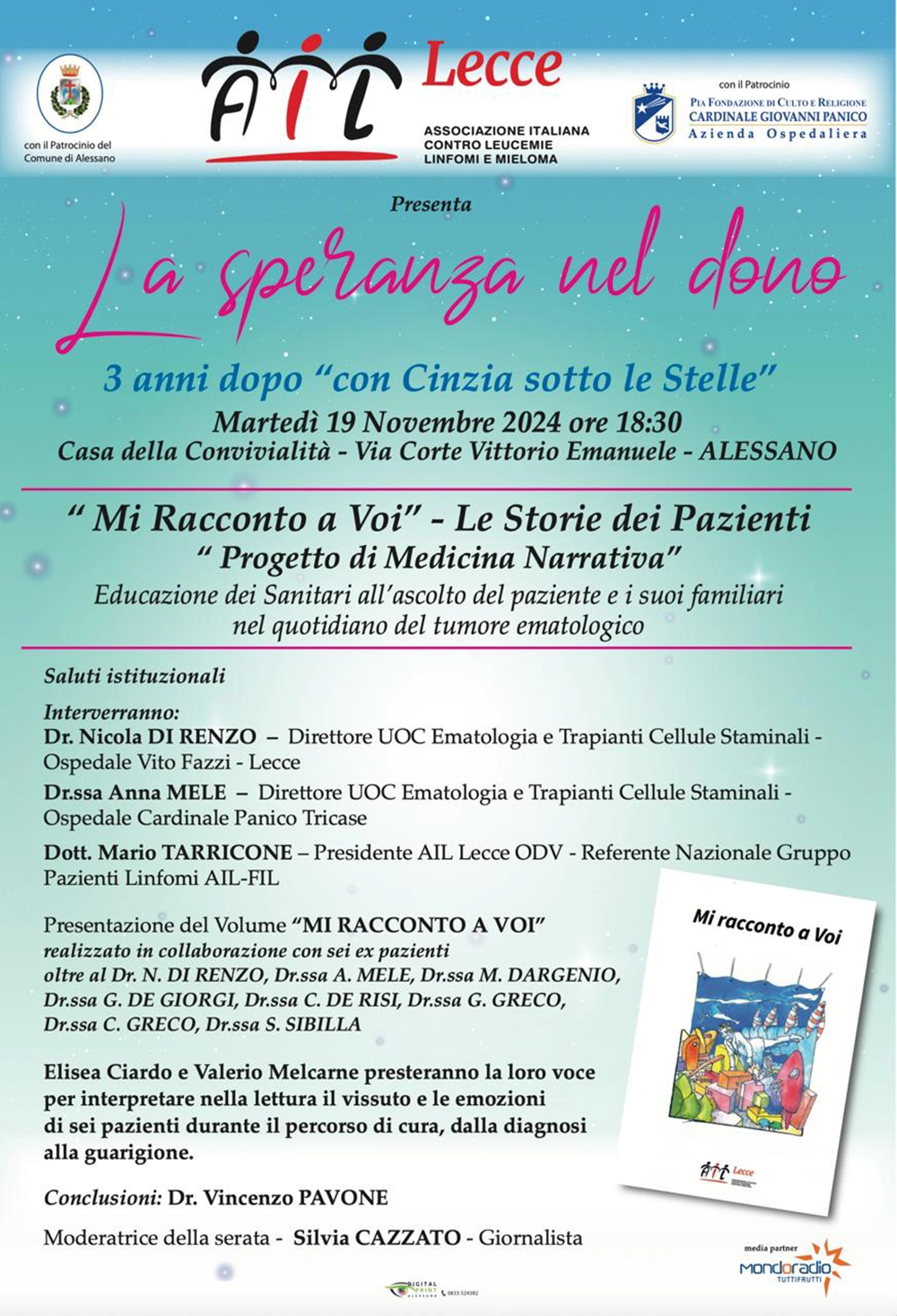 Il fulcro della serata sarà la presentazione del libro “Mi racconto a voi”, realizzato grazie alla collaborazione di sei ex pazienti e un team di professionisti del settore medico, tra cui i dottori Di Renzo, Mele, Dargenio, De Giorgi, De Risi, G. Greco, C. Greco e la dottoressa S. Sibilla.
